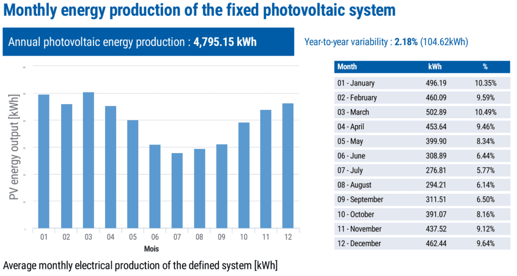 • Performance simulations: Estimates of how much electricity a photovoltaic system would produce at your exact coordinates, with different panel orientations and tilt angles.